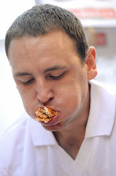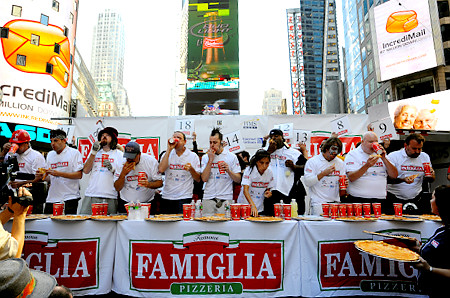 吃披薩大賽:在美國紐約時代廣場舉行的吃批薩大賽,曾在美國國慶吃熱狗大賽中勇奪冠軍的美國“大胃王”切斯納特(Joey Chestnut)再度出擊,并獲得冠軍。