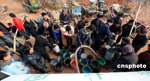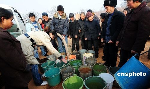 汝陽(yáng)縣城關(guān)鎮(zhèn)張河村,村民們正在用各種裝水工具接鎮(zhèn)政府送來(lái)的飲用水。中新社發(fā) 高山岳 攝