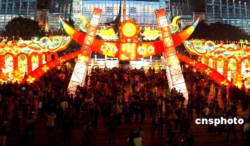 二月五日晚,為期五天的第三屆福州南后街元宵燈會在五一廣場、南后街同時正式亮燈,數(shù)百盞花燈呈現(xiàn)出濃濃的節(jié)日氣氛。圖為福州南后街元宵燈會五一廣場花燈展區(qū),一座50米長的大型門燈以及門燈后的“萬象更新”平安廊前人潮涌動,數(shù)萬市民絡(luò)繹不絕的到此觀賞獨具福州民俗特色的花燈。中新社發(fā) 劉可耕 攝
