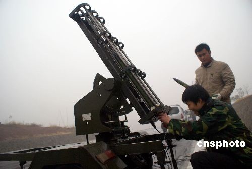 2月7日,河南濟源市為緩解旱情,密切關(guān)注天氣變化,抓住有利時機,當(dāng)天下午在4個地點同時使用火箭和高炮進行人工增雨作業(yè)。