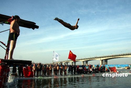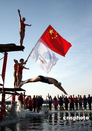2月8日,在哈爾濱松花江公路大橋西側(cè)的黑龍江省冬泳協(xié)會(huì)浴場(chǎng)內(nèi),國(guó)內(nèi)外游客正在觀看冬泳健兒的冬泳表演。當(dāng)日正值哈爾濱第24屆國(guó)際大學(xué)生冬季運(yùn)動(dòng)會(huì)倒計(jì)時(shí)10天。