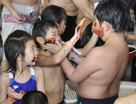 2月8日,游客們在日本神奈川縣享受奇特的“巧克力浴”。