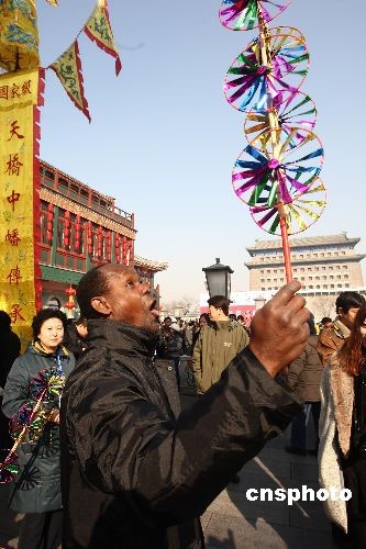 元宵節(jié)來臨,北京前門大街舉行民間花會(huì)踩街活動(dòng),一名外國觀眾手舉風(fēng)車玩得很過癮。踩街是一種中國傳統(tǒng)民間民俗藝術(shù)表演形式,類似國外的花車游行,表演隊(duì)伍邊行進(jìn)邊表演,百姓沿途觀看。中新社發(fā) 杜洋 攝