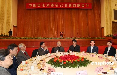 2009年2月10日下午,中國(guó)美術(shù)家協(xié)會(huì)己丑新春聯(lián)誼會(huì)在人民大會(huì)堂隆重舉行。中國(guó)美術(shù)家協(xié)會(huì)會(huì)員及各界友人近千人歡聚一堂, 共迎佳節(jié)。中新社發(fā) 王保勝 攝