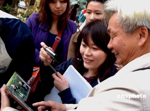 2月11日,一名大熊貓志愿者在福州熊貓世界向前來拍攝大熊貓專題片的臺灣電視臺攝制組人員,展示他本人珍藏的蓋有臺北郵戳的大熊貓“團團”“圓圓”明信片。