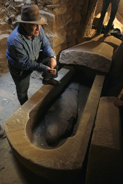 2月11日,在位于塞加拉地區(qū)著名的階梯金字塔西南的墓地中,埃及最高文物委員會主席扎!す咚勾蜷_了一具新發(fā)現(xiàn)的古埃及石棺,并從中找到一具保存完好的木乃伊。