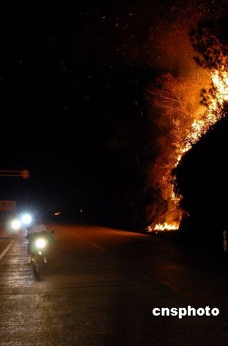 圖為高砂鎮(zhèn)境內(nèi)的公路上,來往的車輛從火叢旁穿流而過。中新社發(fā) 李劍準 攝