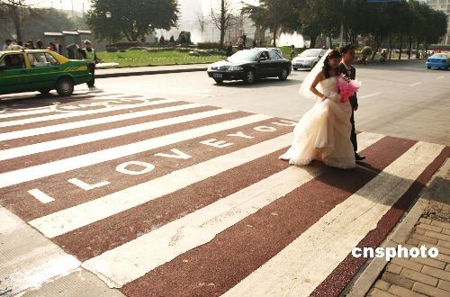 情人節(jié)前夕,位于成都市區(qū)的“愛情斑馬線”迎來了一對對新人。