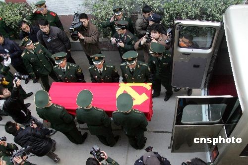 圖為張建勇烈士的靈柩被抬上靈車。中新社發(fā) 富田 攝