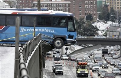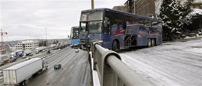 當?shù)貢r間19日,美國西雅圖市兩輛共載有約80名學生的巴士在公路上相撞,兩輛巴士都撞毀道路旁邊的圍欄,圍欄外10多米下就是一條公路。其中單層巴士車頭至前輪部分懸空,非常驚險。