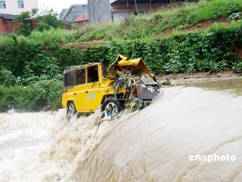 08年6月11日,一輛載人吉普車在通過浙江浦江縣七里村一座小橋時(shí)為避讓對面行人,不幸連車帶人墜入水中。吉普車隨著水流輾轉(zhuǎn)“漂流”1000多米,最終擱淺在溪中下游一座攔水壩處。一位青年正好路過,看到有車子落水,他急忙趕了過去,當(dāng)他看到司機(jī)托起坐在副駕駛室里一名女子時(shí),立即將該女子拉了上來。一會,司機(jī)也從車?yán)镢@了出來,因水勢兇猛,吉普車一路翻轉(zhuǎn),順著溪流沖向下游,他們只能眼睜睜地看著吉普車隨水飄走。中新社發(fā) 許康平 攝