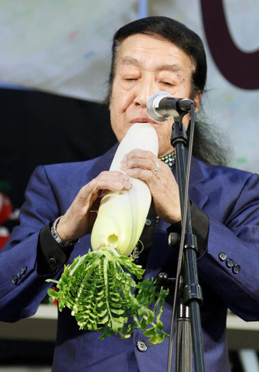 一名表演者在用白蘿卜演奏音樂。