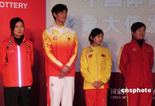 2月17日,中國國家體育總局體育彩票管理中心在北京舉行儀式,聘請六位體育明星擔任中國體育彩票公益形象大使。其中有杜麗、仲滿、何雯娜、張娟娟(從左至右)等四位北京奧運會冠軍。中新社發(fā) 沈晨 攝