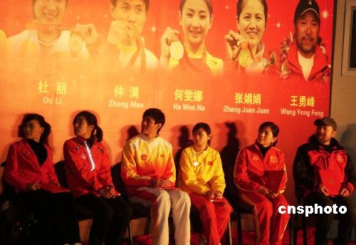 2月17日,中國國家體育總局體育彩票管理中心在北京舉行儀式,聘請桑蘭、杜麗、仲滿、何雯娜、張娟娟、王勇峰(從左至右)等六位體育明星擔(dān)任中國體育彩票公益形象大使。 中新社發(fā) 沈晨 攝