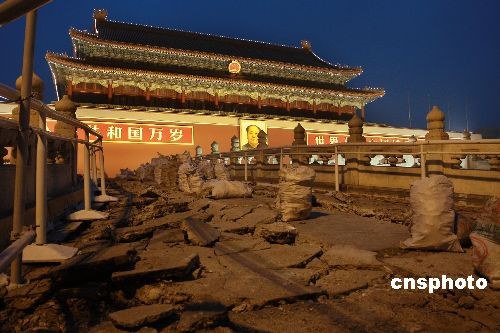 2月18日,為迎接新中國(guó)成立60周年,天安門管委會(huì)從當(dāng)日起對(duì)金水橋?qū)嵤┍Wo(hù)修繕。據(jù)悉,此次修繕工作將分階段進(jìn)行,由于施工圍擋防火板高度有限,因此金水橋和天安門城樓的整體景觀和游覽不會(huì)受到太大影響。工程擬于2009年5月1日前完工,并整體對(duì)外開放。中新社發(fā) 鄭雄增 攝
