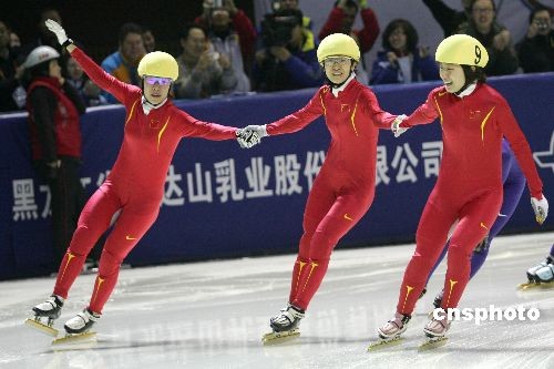 2月19日,世界大冬會(huì)短道速滑女子1500米決賽結(jié)束,中國(guó)隊(duì)包攬前三名,周洋以2分31秒658奪得金牌,這也是中國(guó)代表團(tuán)在本次大冬會(huì)奪得的首枚金牌,劉秋宏和孫琳琳分列2、3位。中新社發(fā) 富田 攝
