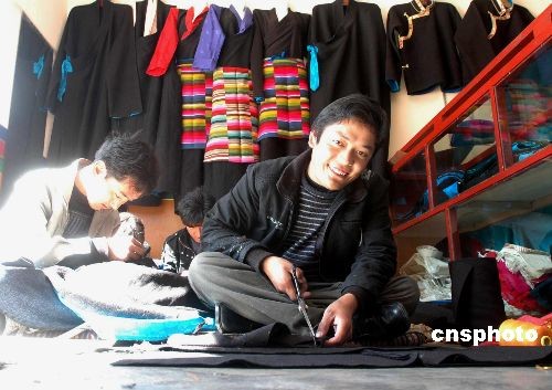 2月20日下午,在充滿節(jié)日氣氛的拉薩江蘇路“藏族傳統(tǒng)山南杰德秀郎布和西瑪服裝訂做室”,專做藏民族傳統(tǒng)服裝的幾個(gè)小伙子在制作漂亮的藏裝。一位叫邊巴次仁的青年表示,藏歷新年就要到了,藏民族新服裝賣得很俏,現(xiàn)在平均每天能銷售近十套,大家天天忙得加班。中新社發(fā) 周波 攝