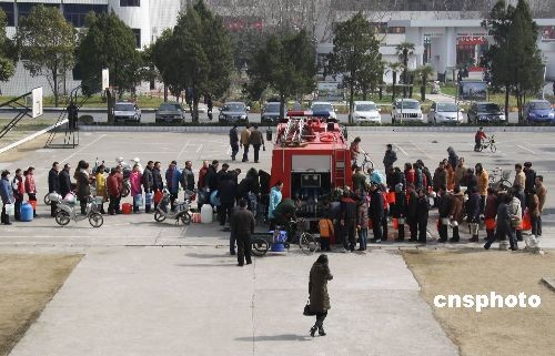2月21日,江蘇省鹽城市各主干道上,消防車輛正為市民輸送安全用水,確保鹽城市民能夠安心喝上未被污染的自來水。由于水廠受酚類化合物污染,鹽城市區(qū)2月20日出現(xiàn)大面積停水,居民生活受到較大影響。造成本次停水的水源地污染原因已經(jīng)確認(rèn),偷排污水的鹽城標(biāo)新化工有限公司被責(zé)令關(guān)閉,法人代表等相關(guān)責(zé)任人被采取強(qiáng)制措施。圖為鹽城市市委黨校內(nèi)前來取水的市民排成了長龍。中新社發(fā) 童盛 攝