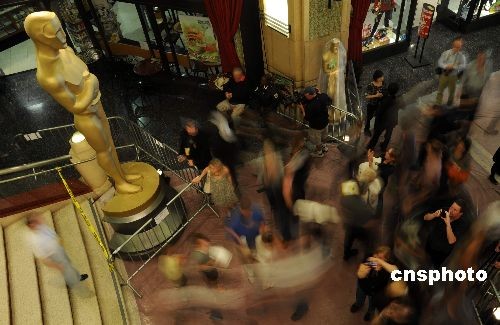 當(dāng)?shù)貢r間二月二十日,大批游客在好萊塢柯達(dá)劇場入口處的奧斯卡金像模型前留影。全球影迷矚目的第八十一屆奧斯卡電影金像獎頒獎典禮將于二十二日晚在這里舉行,柯達(dá)劇場內(nèi)外打扮一新,通往劇場的巨大紅地毯已經(jīng)鋪就,各項準(zhǔn)備工作基本就緒。中新社發(fā) 張煒 攝