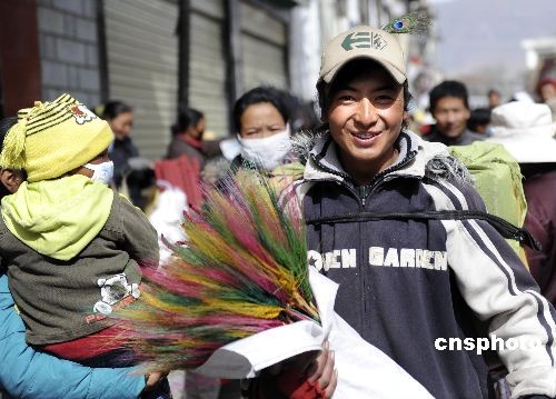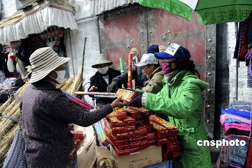 2月23日,藏歷新年前夕,西藏拉薩小昭寺路年貨集市上,藏族民眾歡歡喜喜置辦年貨。