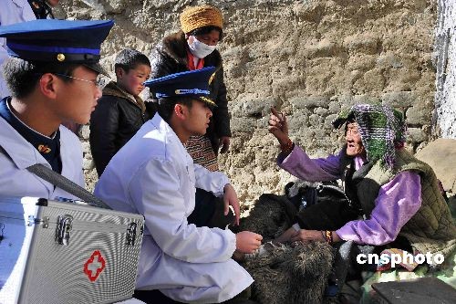 圖為醫(yī)療小分隊(duì)成員深入藏族同胞家中,為行動(dòng)不便的病人診治。中新社發(fā) 郭超英 攝