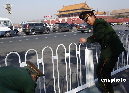 2月27日,全國(guó)“兩會(huì)”即將召開(kāi),北京天安門(mén)廣場(chǎng)進(jìn)行全面清潔整理工作,以迎接“兩會(huì)”開(kāi)幕。中新社發(fā) 鄭雄增 攝
