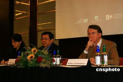 圖為27日下午,陳德銘(中)與英國(guó)商業(yè)、企業(yè)和制度改革大臣曼德?tīng)柹ㄓ桑┕餐瑫?huì)見(jiàn)記者,介紹中英經(jīng)貿(mào)合作成果。中新社發(fā) 李鵬 攝