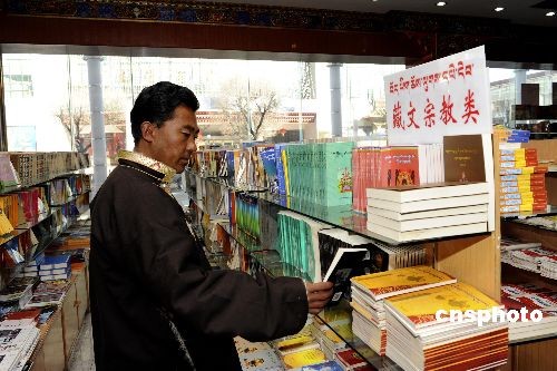 2009年初春,西藏拉薩一書店內(nèi),藏族民眾在選購藏文書籍。西藏自治區(qū)已經(jīng)累計出版各類藏漢文圖書11300種、1.5億多冊。中新社發(fā) 廖攀 攝