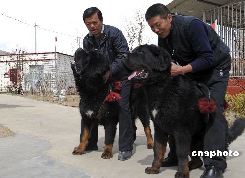 2009年春,西藏拉薩市郊,西藏藏獒協(xié)會(huì)養(yǎng)殖基地兩頭名為“喜馬”和“拉雅”的喜馬拉雅河谷型藏獒嬉戲。曾有客戶出價(jià)數(shù)百萬(wàn)元人民幣都未能如愿能買(mǎi)走“喜馬”。據(jù)了解,全世界像“喜馬”這樣的純血統(tǒng)藏獒不到200只,全西藏也只有20只左右。 牦牛、禿鷲與藏獒被稱為西藏三寶。中新社發(fā) 廖攀 攝