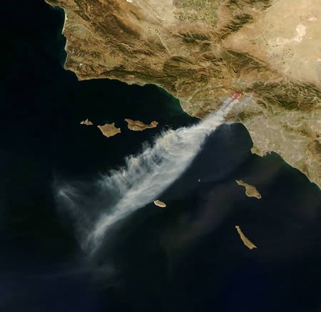 洛杉磯大火的煙霧:這張衛(wèi)星圖片上清晰可見,受強大的圣安娜颶風影響,2008年10月中旬加州洛杉磯附近大火肆虐,風助火勢,濃濃的煙霧甚至飄向很遠的海面。