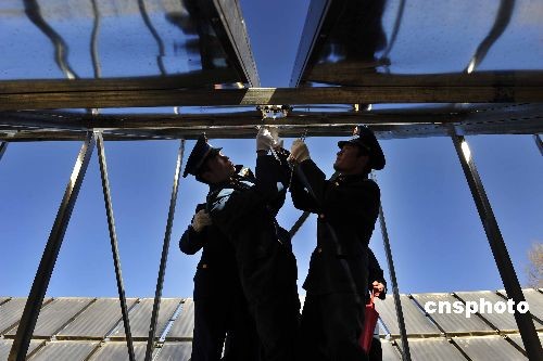 2009年春,一套由800塊太陽能集熱板組成的“營房聚光太陽能采暖系統(tǒng)” 落戶西藏日喀則空軍某場站。這套系統(tǒng)每天能供暖8至10個小時,節(jié)電4800度左右。中新社發(fā) 郭超英 攝