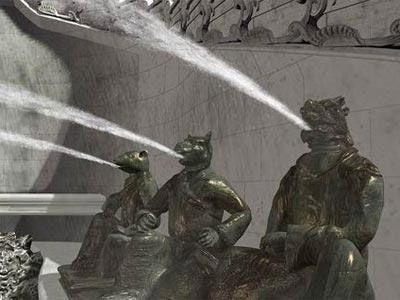 海晏堂由正樓和后工字蓄水樓組成,是最大的一處歐式園林景觀。海晏堂正樓朝西,上下各十一間,樓門(mén)左右有疊落式噴水槽,階下為一大型噴水池,池左右呈"八"字形排列著我國(guó)十二生肖人身獸頭銅像。每晝夜十二個(gè)時(shí)辰,由十二生肖依次輪流噴水,俗稱(chēng)"水力鐘"。