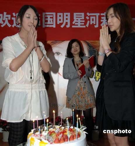 韓國(guó)知名藝人、第一變性美女河莉秀(右)與中國(guó)第一變性美女陳莉莉(左)相聚福州,并共同在許愿蛋糕前許心愿。中新社發(fā) 劉可耕 攝