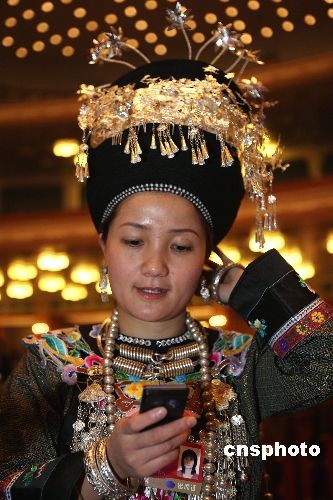 3月4日上午,十一屆全國(guó)人大二次會(huì)議預(yù)備會(huì)在北京人民大會(huì)堂舉行。來(lái)自重慶市黔江區(qū)的苗族女代表李小燕通過(guò)手機(jī)向家鄉(xiāng)“播報(bào)”大會(huì)盛況。中新社發(fā) 任晨鳴 攝
