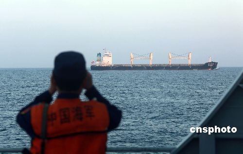 中國(guó)海軍護(hù)航編隊(duì)“?凇碧(hào)導(dǎo)彈驅(qū)逐艦完成接護(hù)遭海盜襲擊商船“雁蕩!碧(hào)任務(wù)。圖為2月26日,接護(hù)途中護(hù)航官兵對(duì)商船進(jìn)行了望、警戒。2月25日,“雁蕩海”號(hào)由于供貨期限原因未能參加護(hù)航,在亞丁灣海域航行途中遭遇海盜襲擊。中新社發(fā) 孫自法 攝