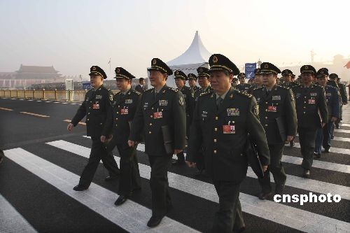 3月5日,十一屆全國(guó)人大二次會(huì)議在北京人民大會(huì)堂開幕。解放軍代表團(tuán)整齊步入會(huì)場(chǎng)。中新社發(fā) 盛佳鵬 攝