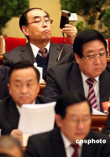 3月5日上午,十一屆全國人大二次會(huì)議在北京人民大會(huì)堂開幕,一名在主席臺(tái)最高層就座的主席團(tuán)成員 “居高臨下”拍攝會(huì)議盛況。中新社發(fā) 任晨鳴 攝