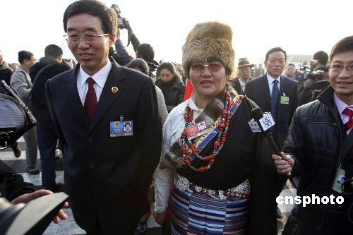 3月5日上午,十一屆全國人大二次會(huì)議在北京人民大會(huì)堂開幕,來自西藏的全國人大代表色珠與列席大會(huì)開幕會(huì)的西藏自治區(qū)人民檢察院檢察長張培中步入會(huì)場。中新社發(fā) 盛佳鵬 攝