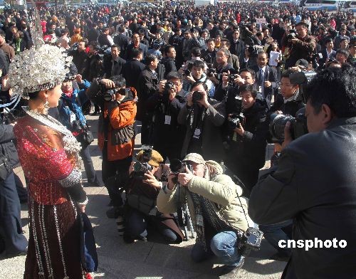 3月5日,十一屆全國(guó)人大二次會(huì)議在北京人民大會(huì)堂開幕,身著苗族盛裝的全國(guó)人大代表雷阿幼朵成為攝影記者的拍照的焦點(diǎn)。中新社發(fā) 張婭子 攝