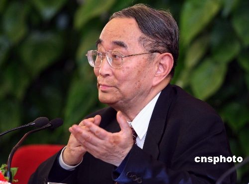 全國政協(xié)常委、著名經(jīng)濟(jì)學(xué)家厲以寧在3月6日下午舉行的全國政協(xié)十一屆二次會(huì)議記者會(huì)上說,當(dāng)前樓價(jià)居高不下,原因是地價(jià)高。他還回答了關(guān)于上調(diào)資源增值稅的說法和提高勞動(dòng)收入在國民收入中分配比例等問題。中新社發(fā) 宋吉河 攝