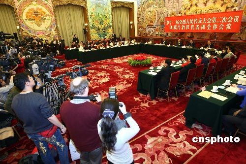 3月6日,十一屆全國(guó)人大二次會(huì)議西藏自治區(qū)代表團(tuán)在人民大會(huì)堂舉行全體會(huì)議,吸引眾多中外媒體的記者。中新社發(fā) 杜洋 攝