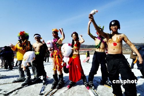 3月7日,沈陽市白清寨滑雪場舉行天體滑雪節(jié),活動分為特色服裝、創(chuàng)意滑雪等項目,全市20位市民報名參加,挑戰(zhàn)嚴寒。中新社發(fā) 文契 攝