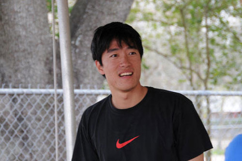 劉翔在休斯敦萊斯大學(xué)田徑場(chǎng)進(jìn)行體能和跨欄技能訓(xùn)練中面露笑容。