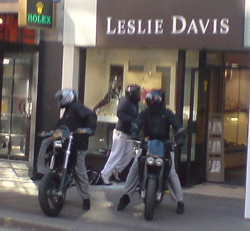 中新網(wǎng)3月8日電 據(jù)英國(guó)媒體報(bào)道,6日,一群摩托黨在倫敦最繁華的大街上搶劫了一家珠寶店。這已經(jīng)是該團(tuán)伙第二次做案。實(shí)施搶劫的有4人,都戴著頭盔以隱藏面部,目擊者表示他們看上去不過(guò)是學(xué)生年紀(jì)。搶劫時(shí),其中兩人沖進(jìn)店里,用大錘砸碎櫥窗玻璃,拿走里面的手表和珠寶;另外兩人則一直開(kāi)著引擎,等前者跳上車后即迅速離開(kāi)。