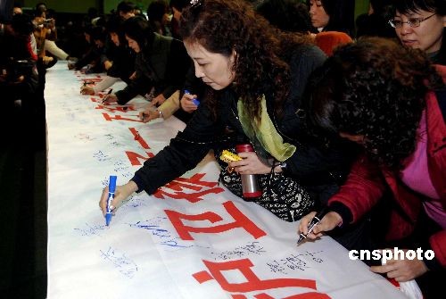 三月八日國際婦女節(jié),由廣東省婦聯(lián)主辦的“凈化網(wǎng)絡(luò)護(hù)衛(wèi)孩子--萬名母親網(wǎng)絡(luò)護(hù)衛(wèi)行動”啟動儀式,在廣州華南師范大學(xué)附屬中學(xué)舉行。圖為母親和孩子紛紛簽名支持該項活動。中新社發(fā) 劉衛(wèi)勇 攝
