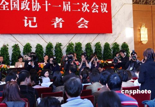 3月8日全國政協(xié)十一屆二次會議舉行記者會,主題是“政協(xié)委員談上海世博會”。萬季飛、周漢民、成岳沖、楊瀾等四位全國政協(xié)委員就上海世博會的經(jīng)濟效應(yīng)及國際國內(nèi)參與上海世博會等回答了中外記者提問。中新社發(fā) 宋吉河 攝