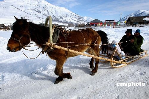 圖為當(dāng)?shù)啬撩耨{馭馬拉爬犁出行。