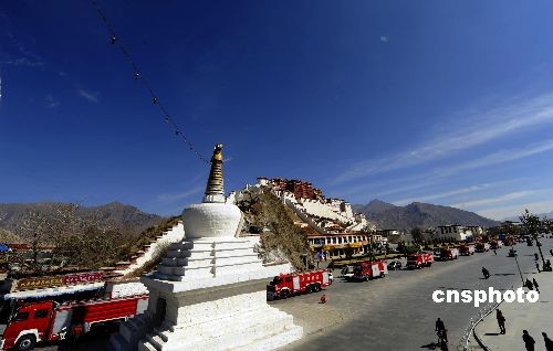 3月10日,西藏公安消防特種裝備車輛駛過(guò)布達(dá)拉宮廣場(chǎng)。當(dāng)日,西藏公安消防特種裝備車輛服役儀式在拉薩市舉行,26輛消防車輛在市區(qū)主要街道進(jìn)行拉動(dòng)演練。中新社發(fā) 廖攀 攝