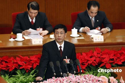 3月10日,十一屆全國人大二次會議在北京人民大會堂舉行第三次全體會議,最高人民檢察院檢察長曹建明向大會作工作報告時說,2009年檢察機關(guān)要著力保障經(jīng)濟平穩(wěn)較快發(fā)展,依法打擊金融、證券、房地產(chǎn)等領(lǐng)域的犯罪活動。中新社發(fā) 盛佳鵬 攝