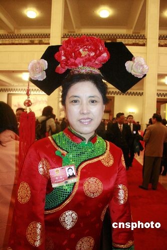 3月10日,圖為人大代表、滿族的那輝滿族裝束驚艷亮相人民大會(huì)堂。中新社發(fā) 金立冬 攝